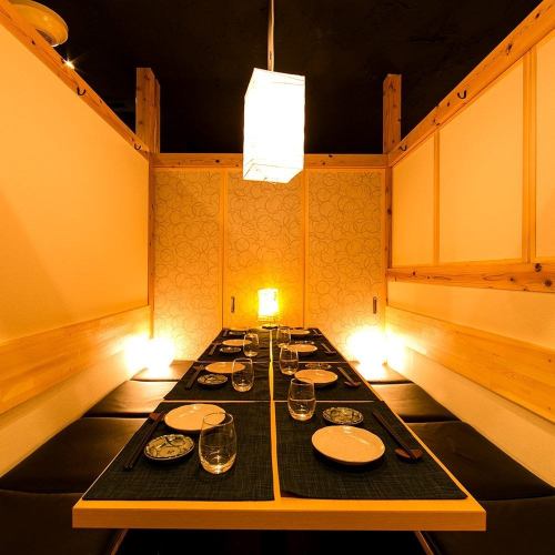 1席に最大12名様でご利用可能な、和風×モダンが演出する落ち着いた完全個室席です。壁や扉で仕切られているため、周りのお客様を気にすることなく、お酒やお食事をお楽しみいただけます。ご宴会にぴったりです。